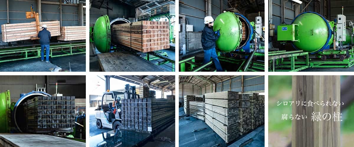 大きなタンクに木材と薬剤を入れて、圧力かけて薬剤を浸透させる「加圧注入処理」という方法を使います。